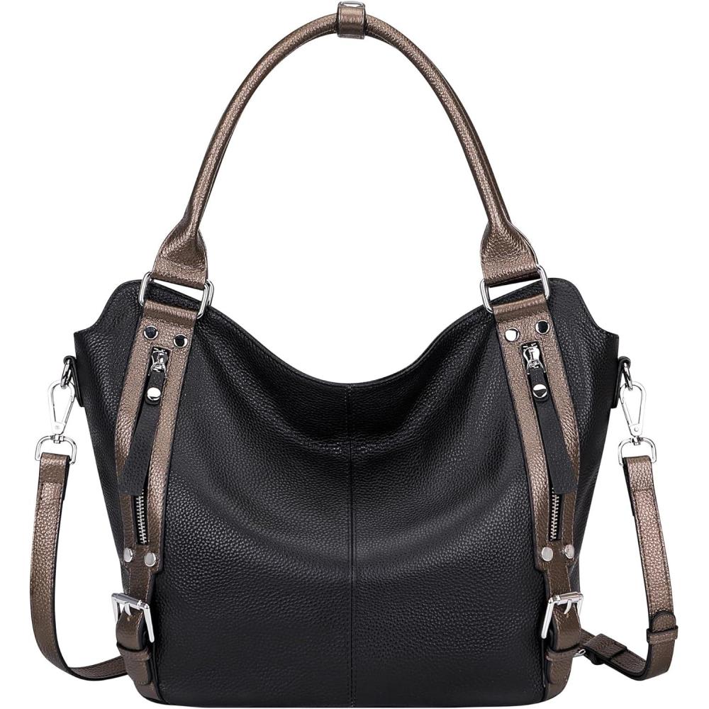 Over Earth Genuine Leather Handbags for Women Hobo Shoulder Bags Ladies Tote Bag(03-black/Bronze)