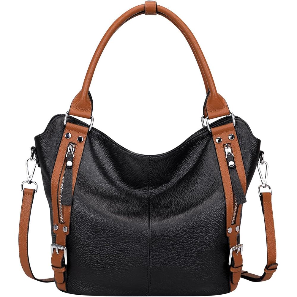 Over Earth Genuine Leather Handbags for Women Hobo Shoulder Bags Ladies Tote Bag(04-black/Brown)
